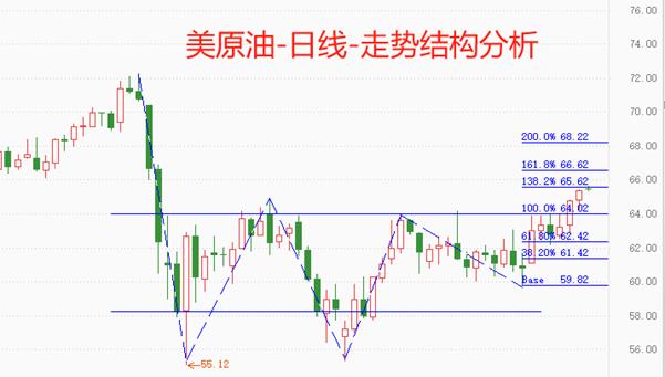 走势结构角度看,日线级别,美原油处于空头趋势下的筑底阶段,最新波段为上涨。2025年4月和5月的震荡走势,形成显著中枢(58~64美元)。上周五,美原油大涨2.21%,最高触及64.8美元,突破中枢上限。本周一,美原油延续涨势,最高触及65.43美元。如果本周行情都没有出现回调,并且收盘价远高于64美元,意味着美原油可能筑底完成,未来可能出现趋势性涨势。