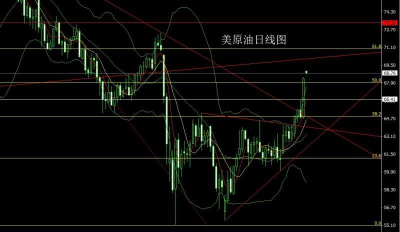 昨日美原油市场早盘开盘在64.82的位置后行情小幅回踩给出64.63的位置后行情强势震荡拉升,位前日倒锤头高点后最高触及到了68.42的位置后行情整理,日线最终收线在了68.27的位置后行情以一根上下影线等长的大阳线收线,而这样的形态收尾后,今日67.5多止损67,目标看68.3和68.8-69.
