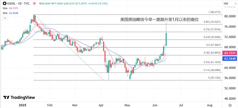 以色列对伊朗发动袭击,由于该地原油产量占全球原油产量的三分之一,市场担忧供应受阻,中东地缘局势急剧升温,国际油价今早冲高,美国原油期货一度大涨近13%,刷新五个月的高位,创三年多来最大涨幅。