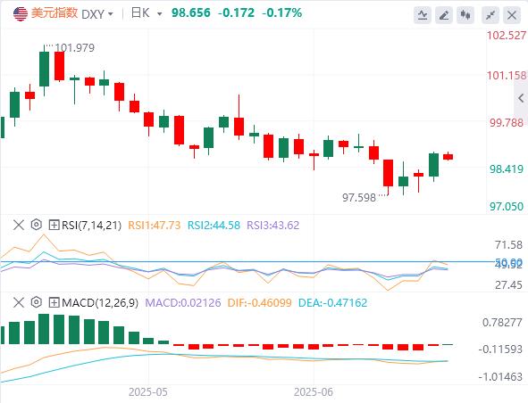周二,美国5月零售销售弱于预期,但消费者支出仍然受到稳健薪资增长的支撑。美元指数先跌后涨,截至目前,美元报价98.65。