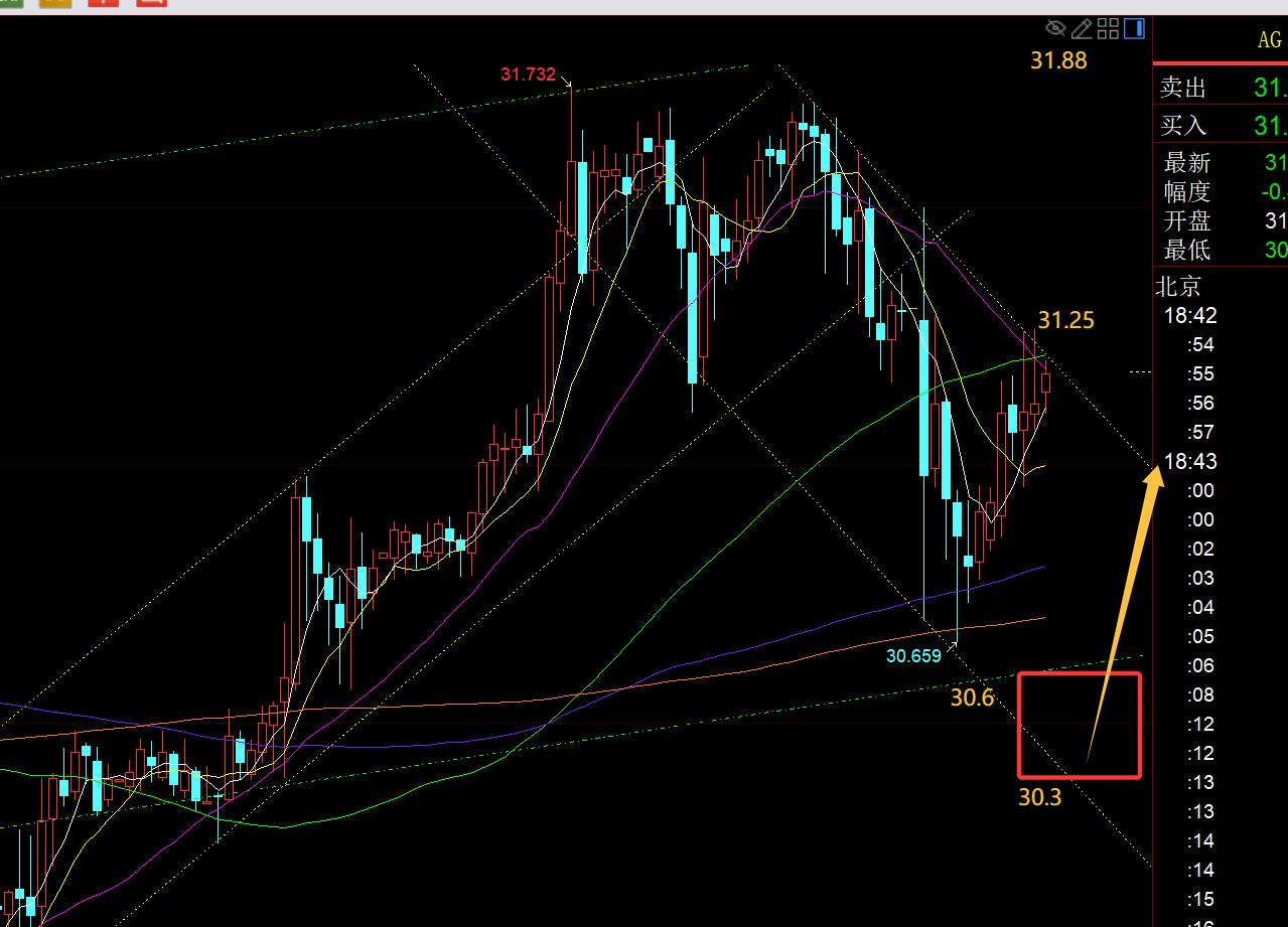 白银方面:当前走震荡下滑通道,而大通道仍处于上行发展,目前小时线中轨31.25下暂时压制,关键下轨支撑30.6,若刺破的话就是30.3,保持30.6-30.3之上震荡看涨,上轨阻力31.88压制再考虑看跌回落,白银就卡通道上下轨这两个位置出手;