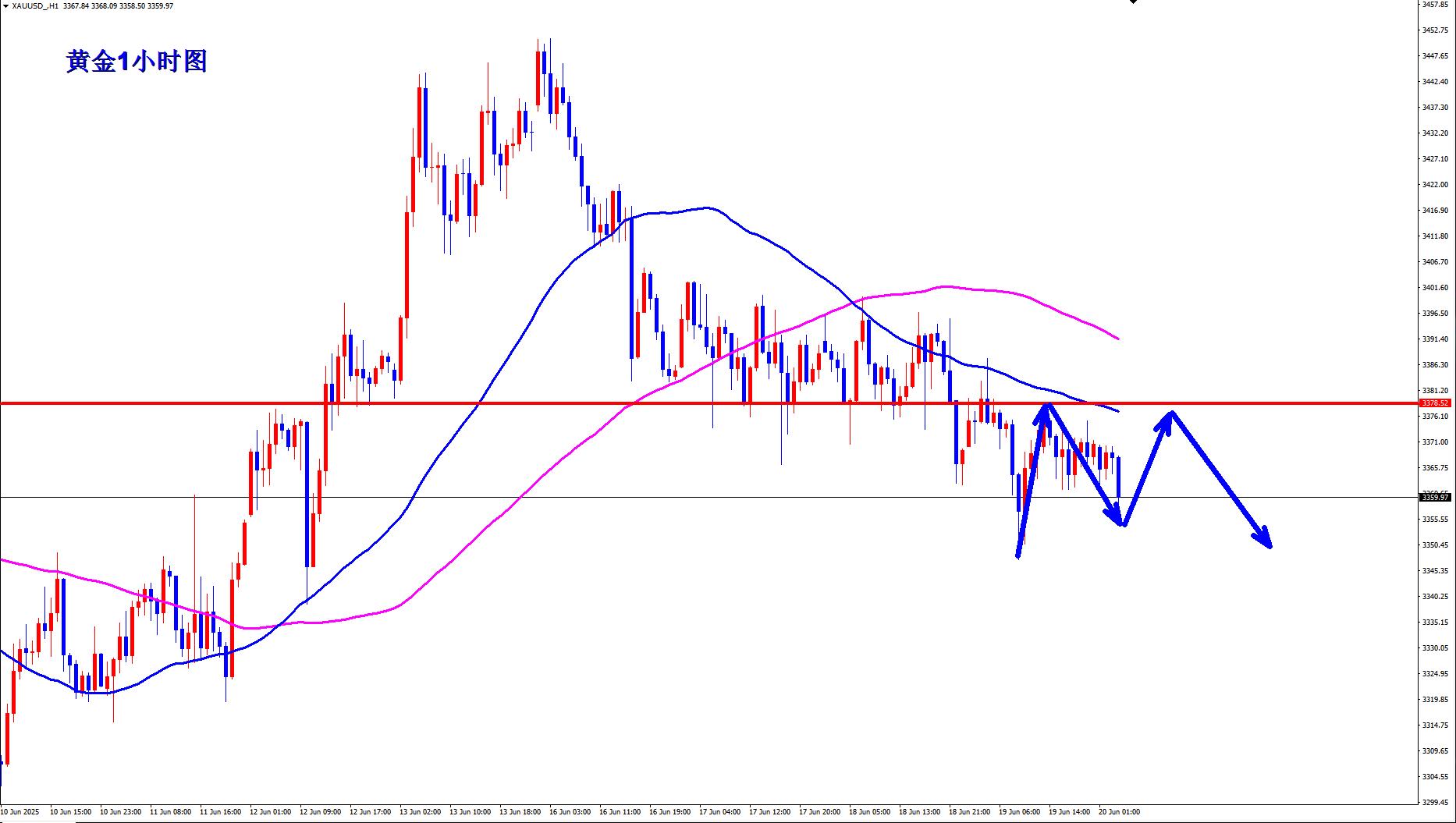 黄金1小时均线还是继续死叉空头向下排列,黄金空头力度十足,下行还有空间,黄金昨天下探之后反弹最高也就是3378附近,就继续回落,然后多次反弹也没有再去突破3378,早盘黄金承压3378下还是继续逢高空。黄金现在震荡下跌,重心不断下移,那么这种走势,黄金向下可能随时还会加速。