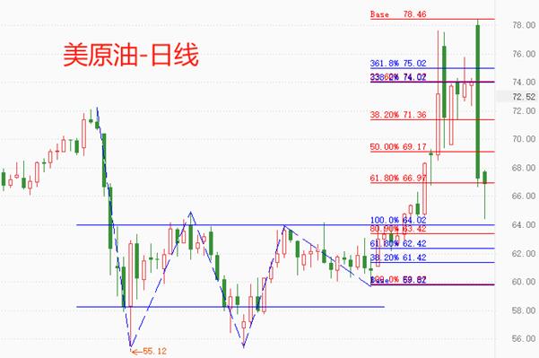 走势结构角度看,日线级别,美原油处于中期多头趋势之中,目前有筑顶迹象。昨日的长阴线出现的过于突然,可能导致大量多头持仓巨额亏损。5月30日开启的上涨波段,最高点达到前一轮下跌波段的四倍左右。从黄金分割角度看,开始于昨日的最新回调波段,最低点已经突破上涨波段的0.618分位,存在趋势反转特征。但由于最新价处于0.618分位所在的66.97美元附近,所以今日收盘点位非常关键。如果收盘价向下远离66.97,则趋势反转基本可以确定。如果位于66.97附近或者上方,则中期多头有望延续。
