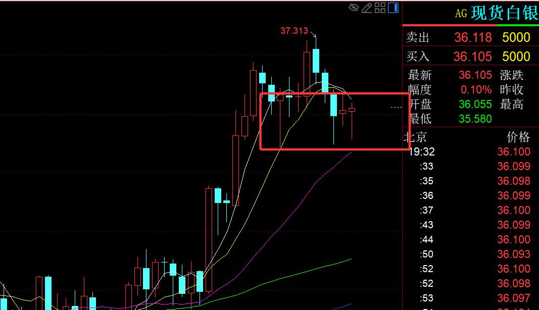 第二,白银方面:当时亚盘黄金出现高开后一路下跌洗盘,担心白银跟随,则36一线提示本钱调仓,结果最终美盘还是震荡拉升逼近36.35-36.4;