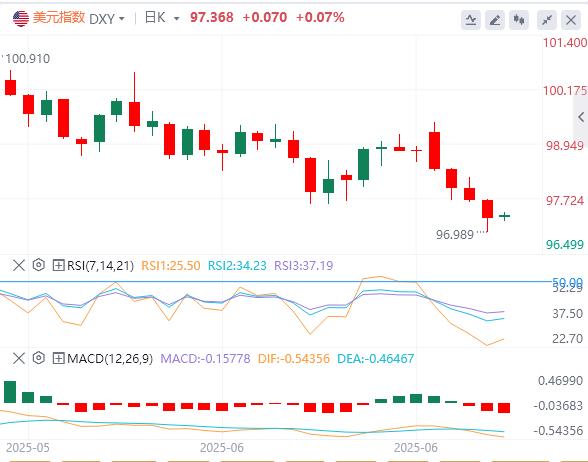 6月27日,北京时间周五亚市早盘,美元指数徘徊在97.369附近。周四,因媒体报道称,特朗普考虑最早在9月份宣布鲍威尔的继任者人选,美元指数盘中回落至97下方,为2022年3月以来首次,最终收跌0.37%,报97.35点。基准的10年期美债收益率收报4.2390%,2年期美债收益率收报3.7280%。美国5年/30年期收益率差突破101个基点,为2021年以来最陡。美国一季度GDP意外下修,但初请数据和实际个人消费支出利多金价,现货黄金持稳,在触及3350美元的日内高点后回落,最终收跌0.17%,收报3327.68美元/盎司;现货白银触及6月18日以来的最高水平,最终收涨0.99%,报36.60美元/盎司。随着夏季驾车季节的到来,美国原油库存因需求增加而下降,油价周四小涨。WTI原油收涨0.43%,报65.16美元/桶;布伦特原油收涨0.47%,报67.91美元/桶。