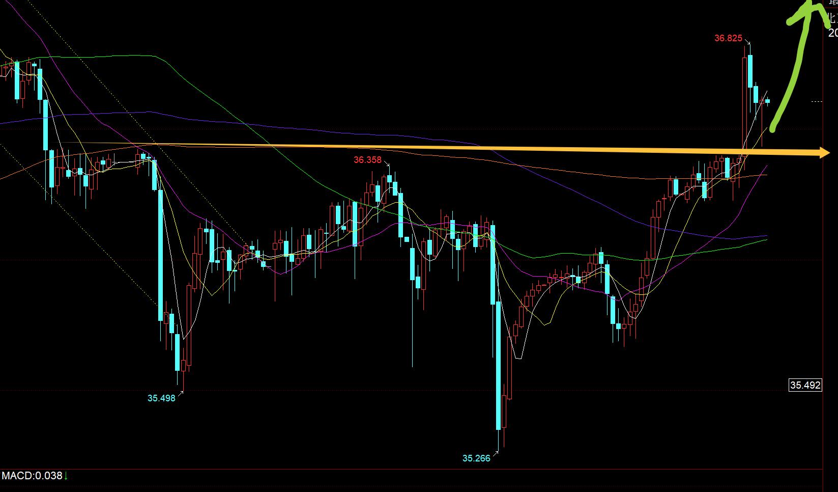 白银方面:它的走势很明确,欧盘大阳有效突破站上36.4横盘阻力位,今晚回踩确认就成为顶底支撑,逢低继续看涨即可,阻力目标36.8,突破看前高37.3一线得失;