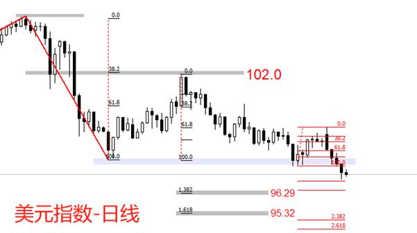 走势结构角度看,日线级别,美元指数处于空头趋势之中,最新波段为下跌,且跌势较为剧烈。短期来看,本轮下跌支撑区间可能在96.4~96.85之间,对应1.382~1.618的黄金分割区间。中期来看,美元指数的跌幅将扩大至95.32~96.29,也就是前一轮反弹波段的1.382~1.618之间。