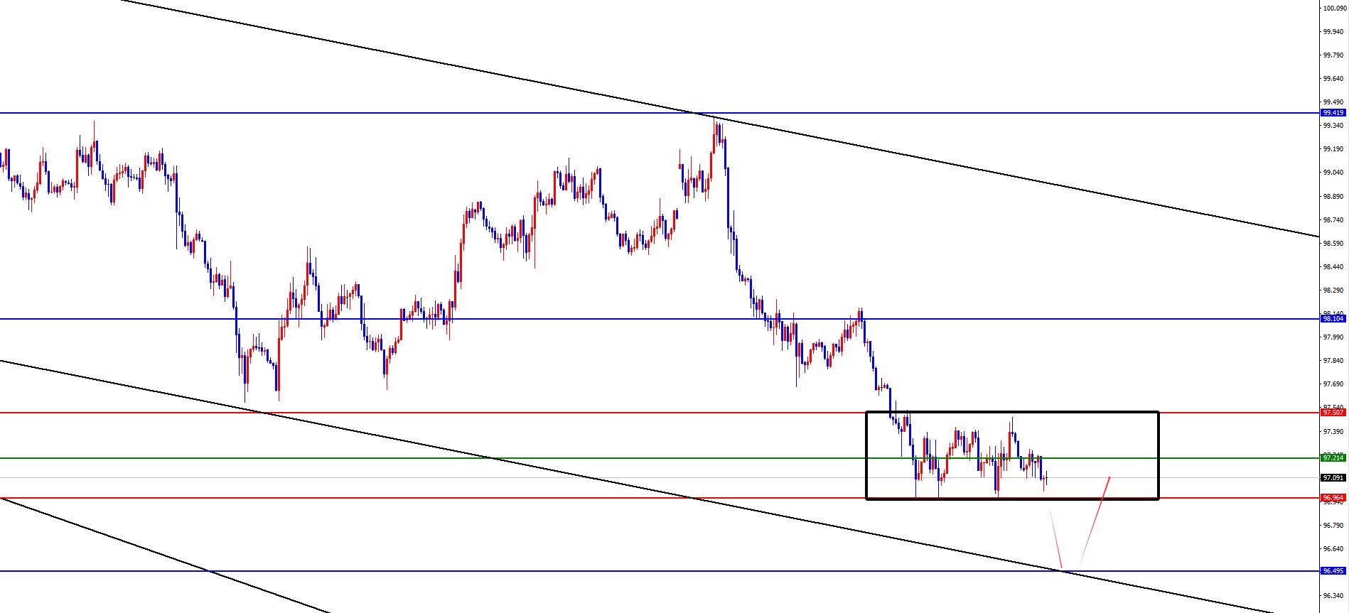 从多周期分析,周线级别来看价格压制在99.40区域阻力,那么从中期视角出发,美元指数的走势将更偏向于空头。在日线级别上随着时间的推移价格关键阻力位置于98.10位置,目前价格在此位置下方,所以暂时我们需要关注进一步延续,但是目前价格接近上涨趋势线支撑区域,后续需要关注趋势线支撑情况。同时四小时上价格持续承压,短线暂时需要关注97.20区域阻力,同时四小时上暂时关注96.95-97.50区间,价格破位后短线延续。所以暂时虽然偏空,但是需要注意市场探底回升表现。另外从短线下跌通道看,下方96.50区域同样是通道下边缘位置,所以后续需要重点关注此位置支撑上涨。