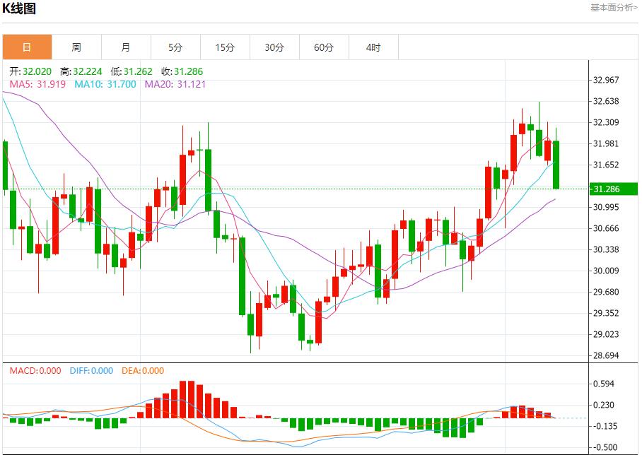 现货白银:截止北京时间21:20,现货白银下跌,现报31.235,跌幅2.47%。纽市盘前,白银价格今天开始明显下跌,以测试关键支撑31.63美元,受随机利空影响,以压制该支撑,注意EMA50试图提供积极支撑并保护上述水平。