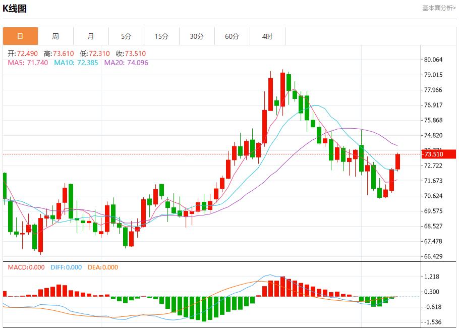 原油市场:截止北京时间21:20,美油xn--xm-6d1dw86k.com上涨,现报73.540,涨幅1.69%。纽市盘前,原油价格在昨天晚上交易活跃,突破72.30美元并收于日线蜡烛线上方,在日内的基础上朝着建立预期的牛市方向发展,主要是在实现73.90美元区域的收益。