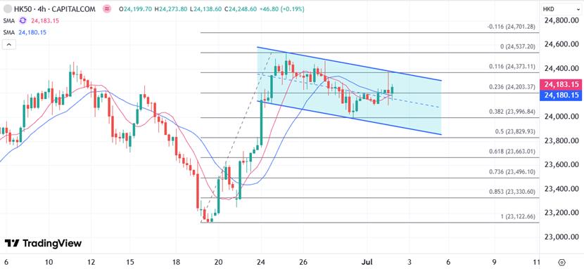 XM:港股假期后迎来7月首个交易日,恒指高开230点,升超过300点后升幅收窄,恒指半日收报24220,升148点。午后初段窄幅上落,保持逾百点升幅。4小时图显示HK50指数在近期下行通道顶部遇阻后回撤,暂时测试均线支撑,日内收盘需要保持均线上方以维持偏向看涨的势头。