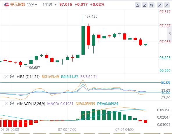 7月4日,北京时间周五亚市早盘,美元指数徘徊在97.01附近。周四,因美国就业数据强劲打消了市场对美联储近期的降息预期,美元指数在美盘前大幅上涨,再回97关口上方,并一度涨至97.42的日内高点,最终收涨0.32%,报97.08;基准的10年期美债收益率收报4.351%,2年期美债收益率收报3.892%。现货黄金则大幅回落,盘中一度跌至3311.65美元,较日高大跌超50美元,随后收复部分失地,最终收跌0.94%,收报3325.50美元/盎司;现货白银虽有所回落但反弹剧烈,最终收涨0.78%,报36.82美元/盎司。在不确定性笼罩之下,两油陷入区间。WTI原油在66美元附近来回震荡,最终收跌0.58%,报66.23美元/桶;布伦特原油收跌0.39%,报68.51美元/桶。