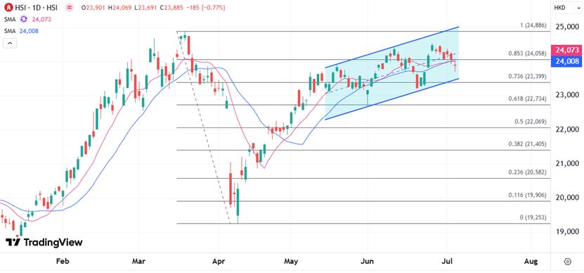 港股7月第一周提前锁定跌幅,昨日北水连买25日的势头中断,科技股成为主要套现目标,日内科技股尝试反弹但是大型科技股略显乏力,所以恒指一直在24000关口上下徘徊,需要消息面的利好刺激才能摆脱整理模式。技术面当前徘徊在上行通道中轨附近,也是日图均线下方,如果日内收低于该位,则周一可能延续弱势的整理。