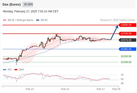 德国DAX指数期货(Eurex)?(H5)?当日内:在22385.00之上,看涨。