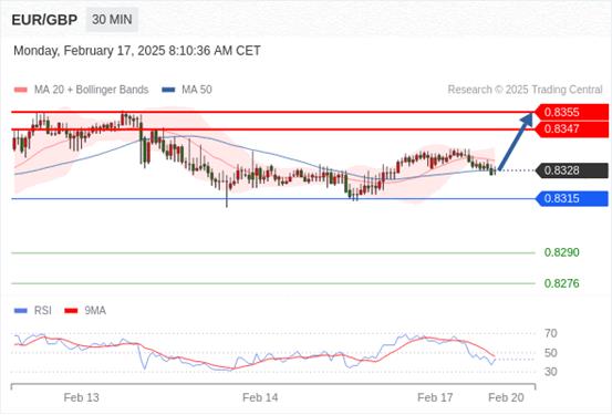 欧元/英镑当日内:超短线(当日内)支撑位在0.8315附近。