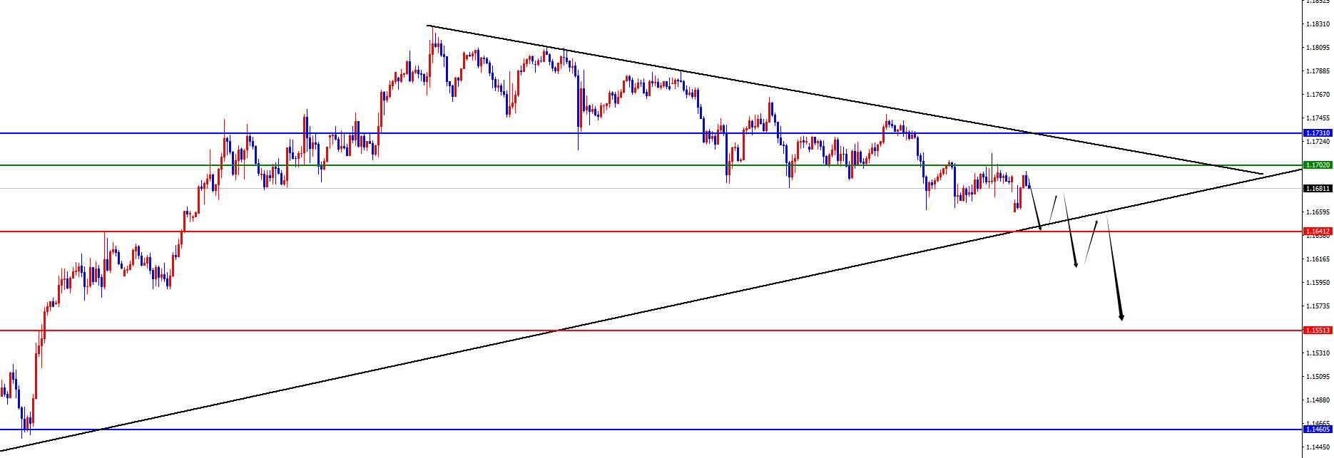 从多周期分析,从月线级别来看,欧美受撑于1.0950位置,所以长线多头对待,月线大阳收尾,则长线上依旧偏多。从周线级别看价格受撑于1.1460区域的支撑,从中线的角度持续看多,价格下跌暂时作为中线上涨中的修正对待。从日线级别,伴随着时间的推移暂时需要重点关注1.1730位置,价格正如笔者所言进一步下破,后续此位置之下波段空对待。从四小时级别看暂时需要关注1.1700区域阻力,价格在此位置之下短期偏空对待。同时按照一小时级别看,目前价格短线震荡下跌,所以暂时价格于四小时及日线阻力持续看承压即可,后续下破前期上涨趋势线后关注进一步加速。