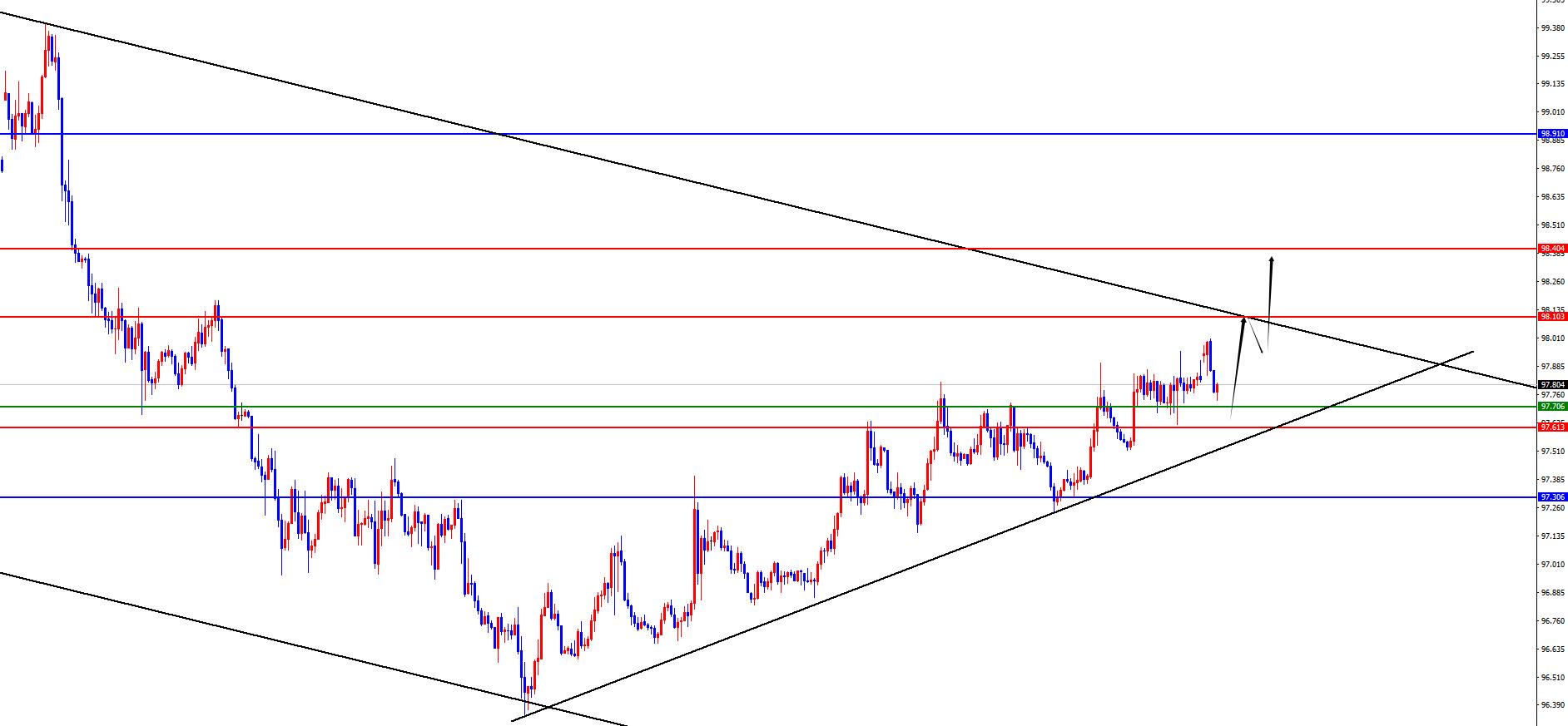 从多周期分析,周线级别来看价格压制在98.90区域阻力,那么从中期视角出发,美元指数的走势将更偏向于空头。在日线级别上随着时间的推移价格关键支撑位置于97.30位置,价格目前已经实际突破并站稳,后续在此之上波段多对待。四小时上近期价格正如笔者所言在触及至通道线后支撑上涨,目前持续上涨中,随着时间的推移目前四小时支撑于97.70位置,价格在此位置之上继续偏多对待。一小时上看目前短线价格向下修正,短线先关注四小时支撑,价格整体在日线及四小时支撑之上看多不变,后续关注测试周线阻力区域。