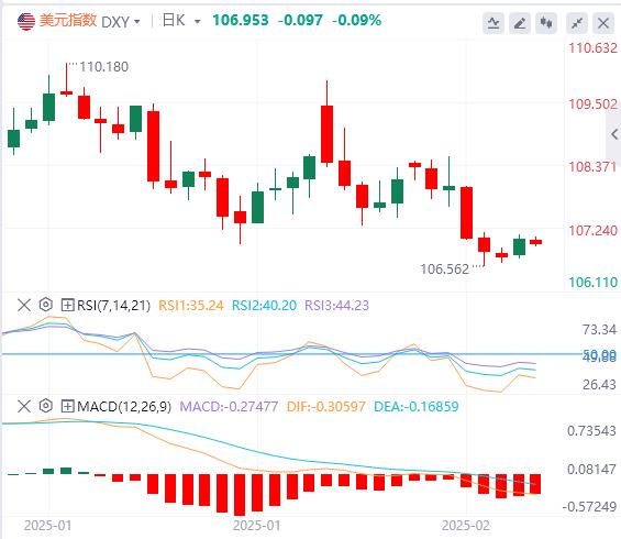 周二,因特朗普关税计划和俄乌和谈存在不确定性引发了避险买盘,美元指数最终收涨0.28%,截至目前,美元报价106.95。