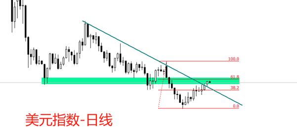 走势结构角度看,日线级别,美元指数处于中长期空头趋势,目前尚未出现筑底结构,空头延续概率较高。最细波段为上涨,最高点为98.11点。最高点已经处于中短期下降趋势线上方,有转势可能。最高价位于前一轮下跌波段的0.618分位附近,有可能遇阻回落。绿色区域是前一轮行情的支撑位,有可能演变为当前上涨波段的阻力区间。综合来看,上涨波段的最高点面临双重阻力和一条趋势线的支撑,未来走势不确定性较高。