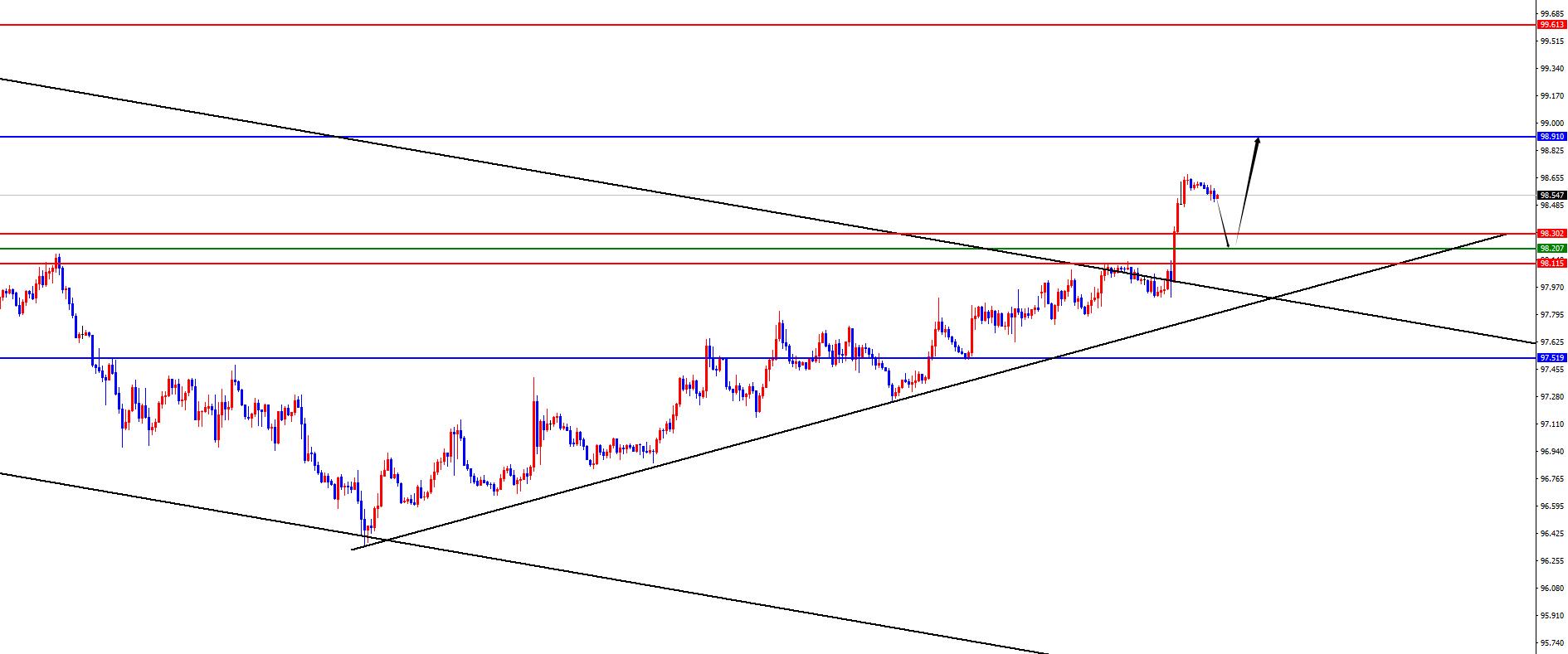 美指98.20-30区间多,防守5美金,目标98.90-99.60