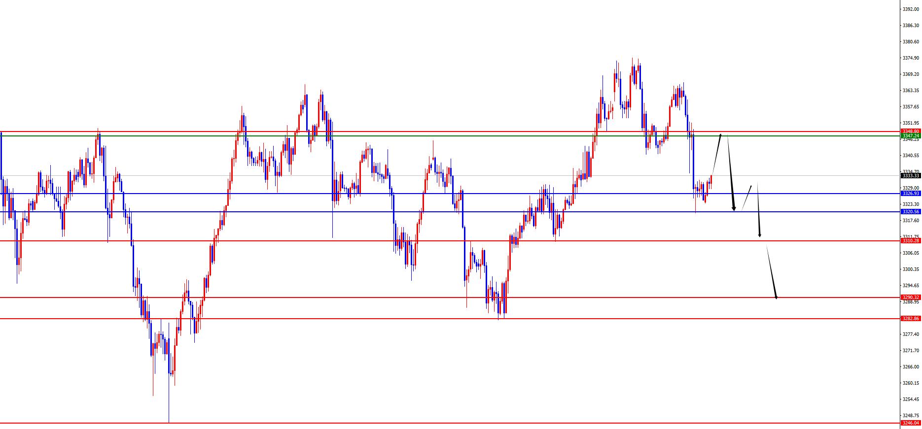 从多周期分析,首先观察月线节奏,价格在5月份正如笔者所言按照节奏运行,并且最终十字状态,6月份最终价格依旧是反K状态收尾,所以针对多依旧需要谨慎对待。从周线级别看,周线上近期价格持续高位震荡,随着时间的推移周线分水岭暂时于3320-3322位置,对于后续价格周线收盘在此位置将进一步承压。按照日线级别看,价格在上周五突破日线级别阻力位置,周一价格如期于下跌回撤的618位置止步下跌,并且最终日线大阴收尾,周二价格并再度刺破日线支撑,后续需要关注进一步下破表现。按照四小时级别看,上周四价格站稳四小时阻力位置,之后短线向上反弹,在昨日价格跌破日线支撑位置,目前短期市场偏空,位置上暂时关注3347-3348区间阻力。一小时上价格短线震荡调整中,后续暂时关注3343区域阻力,综合看在没有下破昨日低点之前按照震荡下跌对待,后续关注下方3220-3310-3290区域。