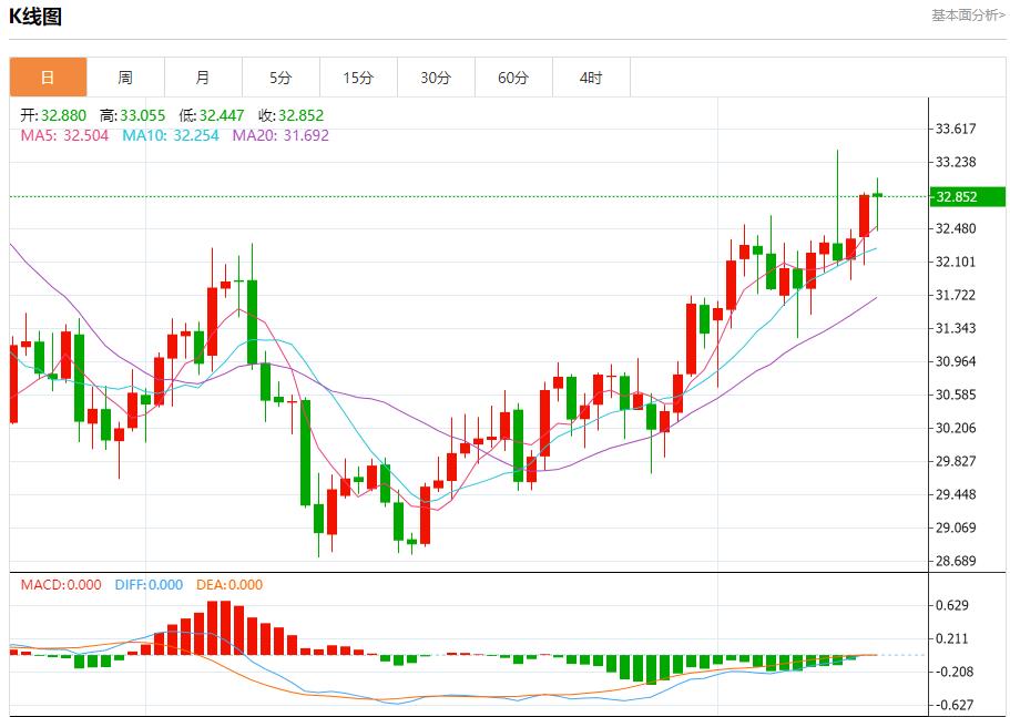 现货白银:截止北京时间21:18,现货白银下跌,现报32.853,跌幅0.05%。纽市盘前,白银价格继续上涨,成功触及我们等待的目标32.86美元,注意到价格在今天开盘时熊市反弹,走向对次要支撑32.25美元的潜在测试,注意到打破这一水平将推动价格继续下跌,并在任何新的积极尝试之前测试31.80美元区域。