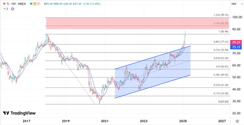 集团同时宣布,拟进一步回购最多达20亿美元股份,符合市场预期,料将於公布第一季业绩前完成。不过股价在短线上涨后部分回吐,盘中一度上测88.80港元,超越2018年1月份的高位,显示业绩后伴随市场结利,稍作调整不排除会重新测试80港元关口左右,而更长期来看顺延银行股的升势,有望以90至100港元为目标。