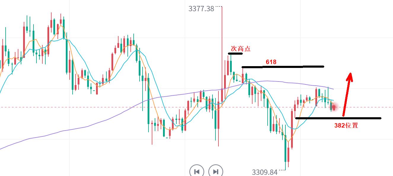 日内需要考虑的位置3330一线,这是昨日上升回撤382位置,通常前一次上升,第二次进场位置三个: