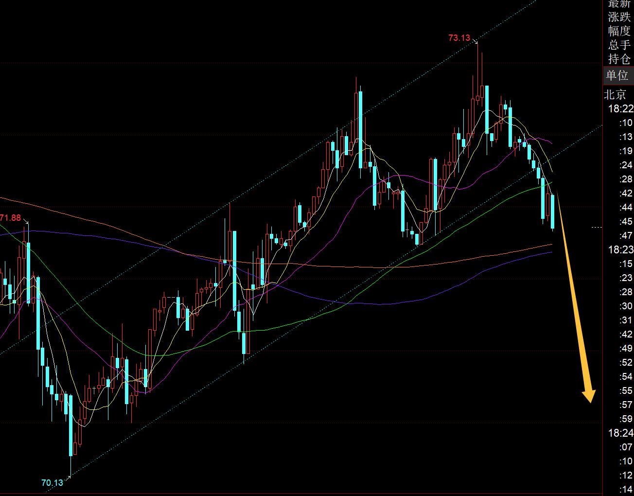 原油方面:日线中轨仍承压有效,日内短期上行通道下轨有效失守,今晚看跌走弱,72-72.4下看下行,支撑目标71.3、70.85,甚至70;