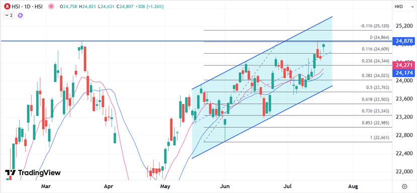 XM港股:在科技股早段的强势下,港股今日早市曾升逾300点,其后升幅收窄,临近中午收市升幅收窄,半日收报24676,升177点。午后初段续升逾百点,在24600点水平争持。国指升69点或0.8%,报8,922点;恒生科技指数升41点或0.8%,报5,490点。