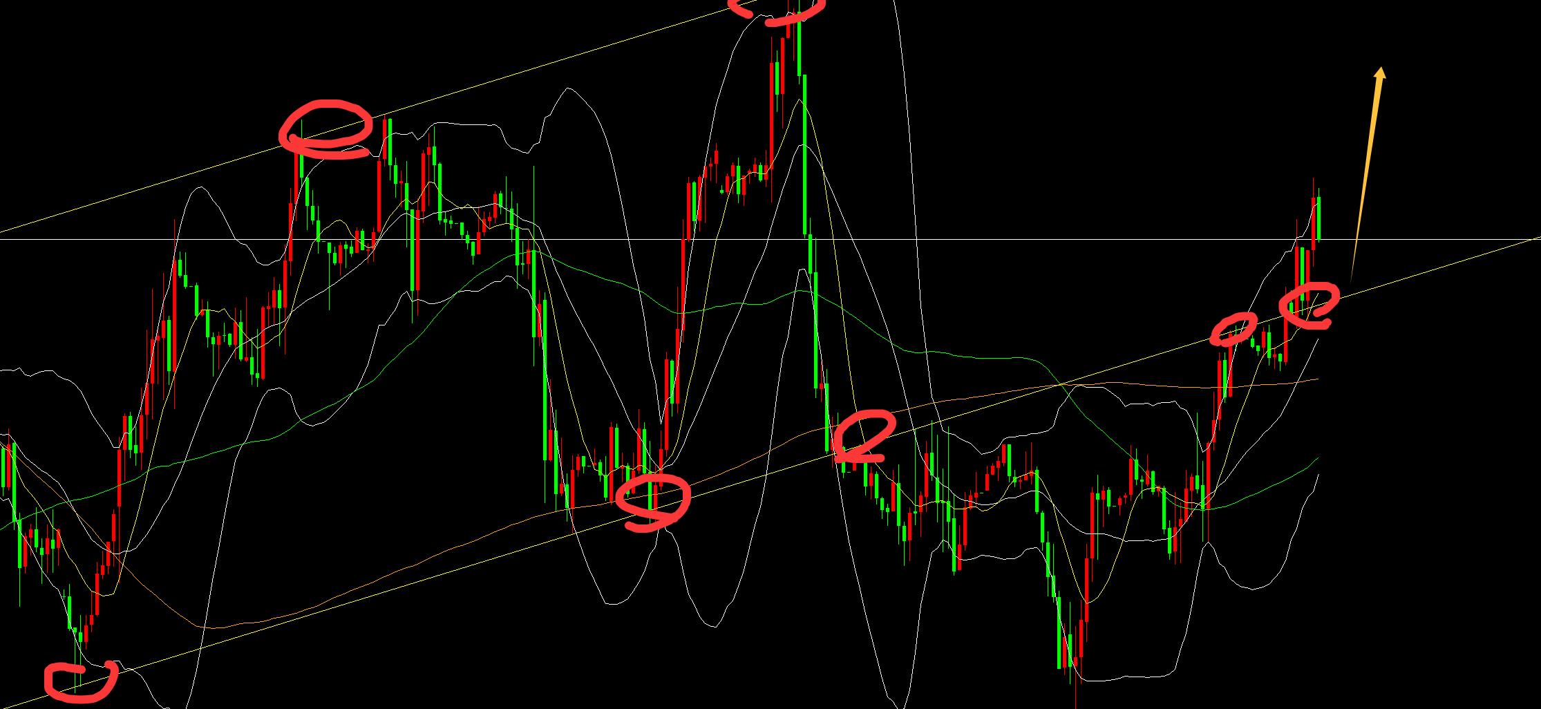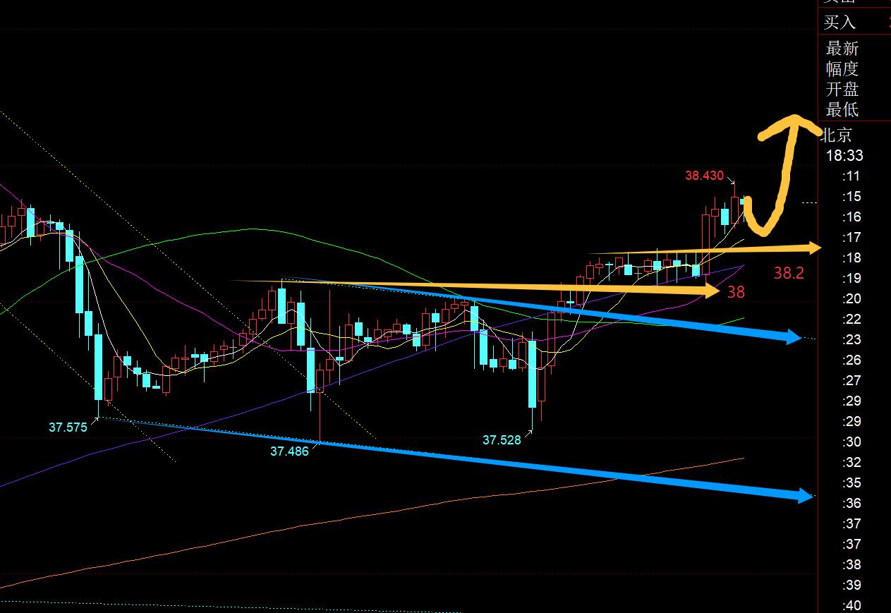 白银方面:原本今日早间想等待上图蓝色通道的上轨进行回踩确认继续跟随看涨,因为它突破了,但并未给到37.9,略差0.1,那么它选择的走法就是依托顶底;既然这样,今晚的下一个顶底就是38.2一线亚盘的高点作为支撑,此位置上继续选择看涨向上,阻力目标38.45、38.75-38.8等;
