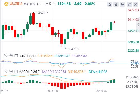 周二亚盘,黄金徘徊在3394.73附近。受到美元走软、美债收益率下滑以及全球贸易紧张局势加剧的推动,金价周一飙升逾1%,盘中创下五周新高3401.41美元/盎司,收盘报3396.91美元/盎司。随着8月1日美国对全球贸易伙伴施加新关税的最后期限临近,市场的不确定性为黄金提供了强劲的支撑。