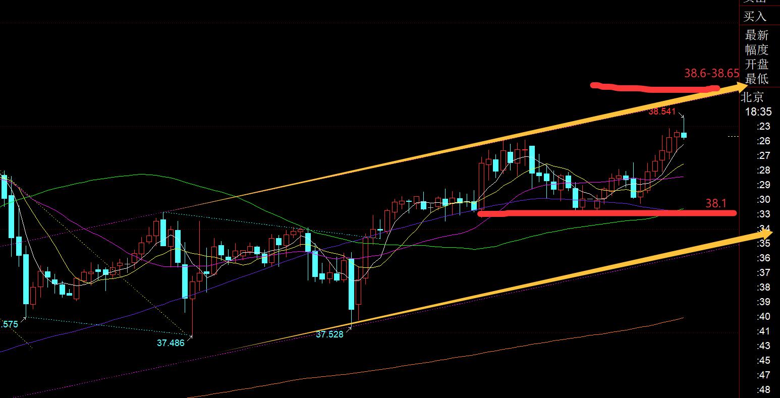 白银方面:今日白银的阻力留意38.6-38.65,支撑38.1-38.2,区间内还要震荡整理下,继续震荡慢上行对待;若强攻突破阻力位,就延续上拉看38.8-39;