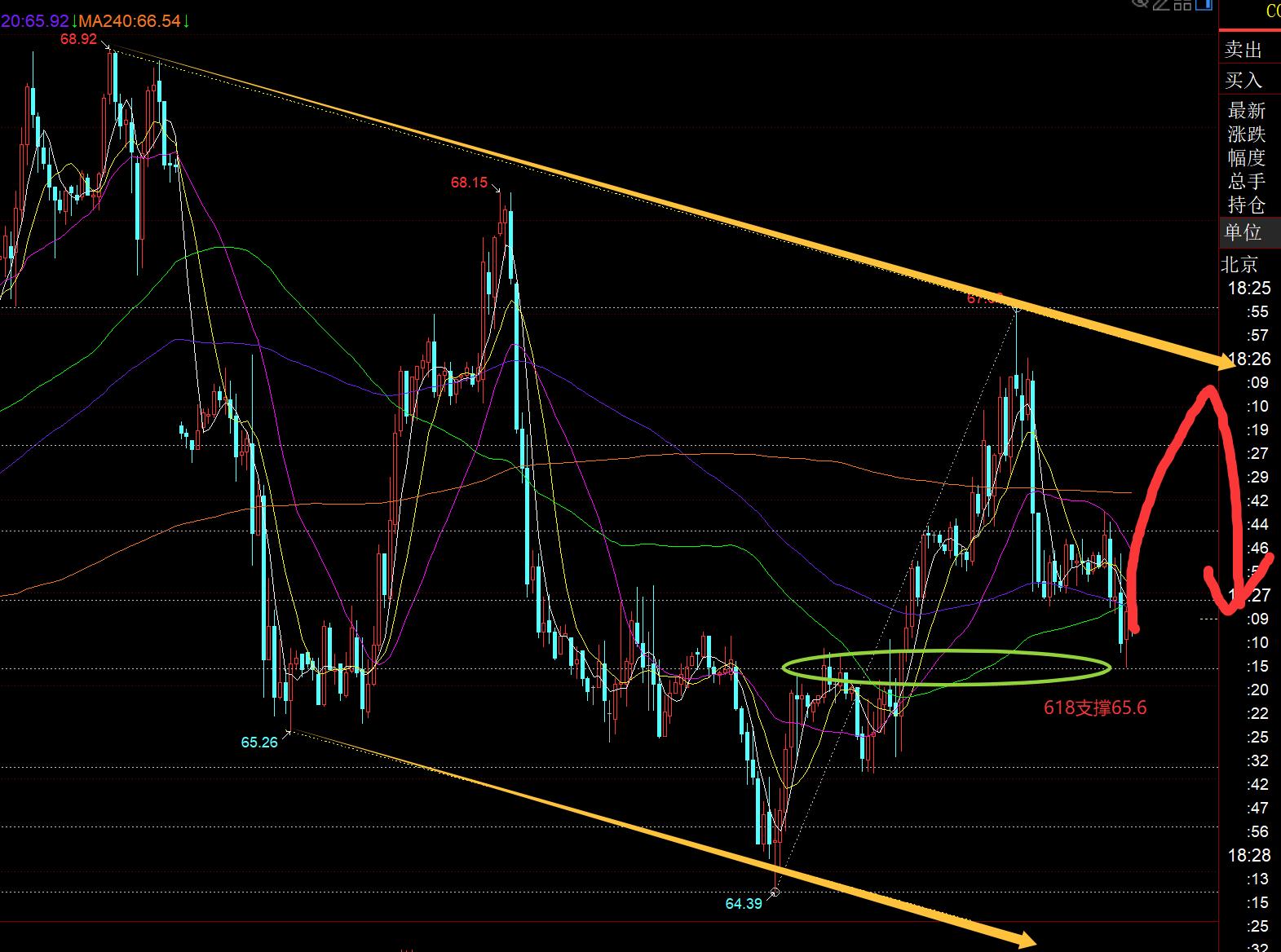 原油方面:上周五收报冲高长上影K,短期出现压制,从上图看,又回到下行通道之内;但当前价格不适合追跌,一方面是由于短周期macd出现底背离,另一个方面65.5一线刚好是前一波上涨回踩的618分割支撑;因此,今晚认为守住65.5,则先向上看一波反弹,再逐步靠近上轨67.3之下,再逢高去选择看跌;