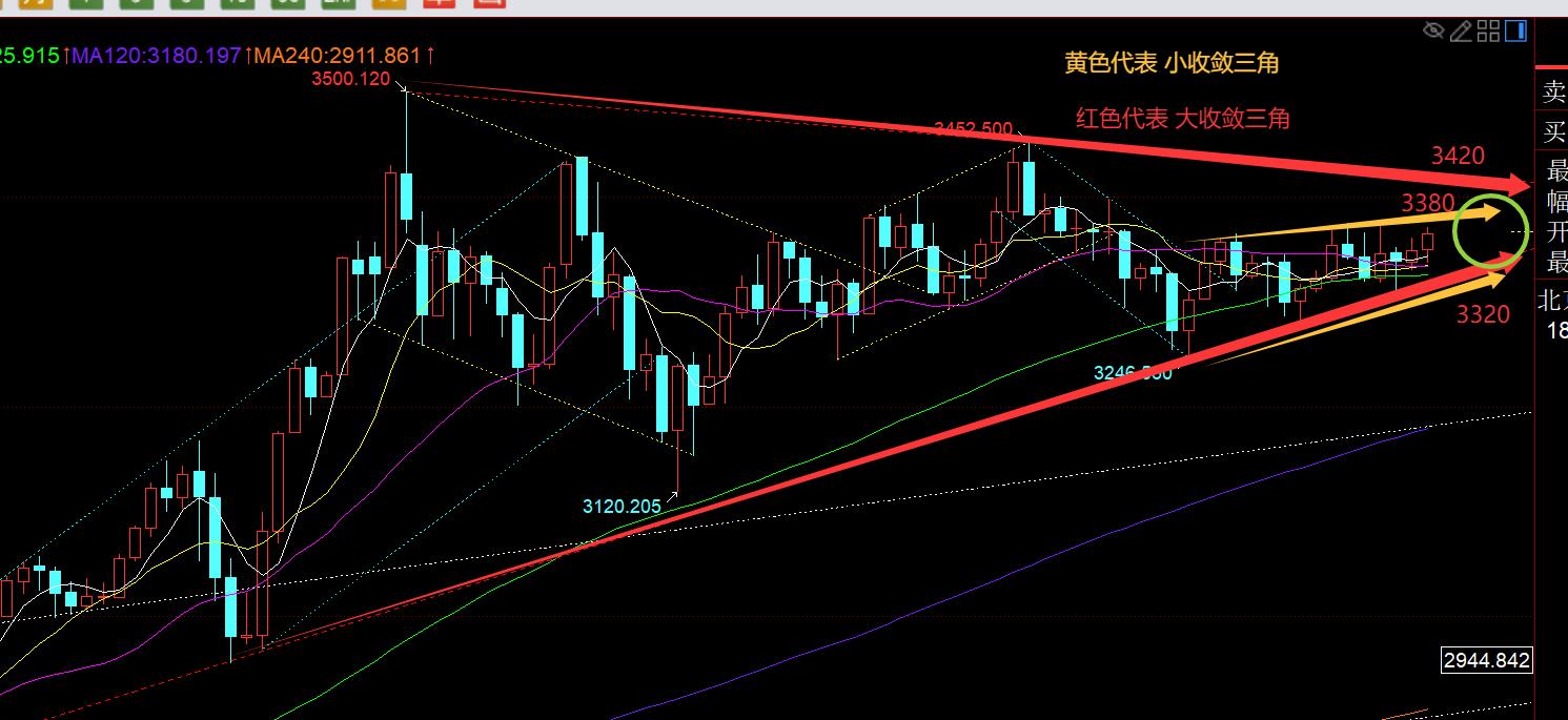 第一,黄金日线级别:3310一线收敛三角下轨触及再次企稳成功,接下来就是按照循环走法,至少连续三日会处于拉升状态,今日算是第三日;如果3365-3377趋势阻力线对应的衍生承压点3380一线还是未能直接突破站上的话,就可能又要循环压制一波,去反复测试大收敛三角下轨支撑点,但有一点可以发现,3365压制那次,回调时间五日,而3377压制那次,回调时间四日,这其实不难理解,因为下轨趋势线低点是在不断上移的,而上方趋势阻力线破高的力度并不是很大,这就导致小收敛三角的口子极具缩小,因此若压制3380再下滑回调的时间就不会超过三日;直到最终等市场来选择突破方向,在下轨支撑一直未有效失守之前,个人会继续倾向于等待上破,等后市突破站上3365-3377这条小收敛三角上轨线之后,就会去测试大收敛三角上轨线压力(3500-3452),本周会下移3420一线;而只有突破站上大收敛三角上轨,才能正式有概率启动大单边拉升,回归大牛市,调整结束,这预计最多两周之内,就会做出选择;