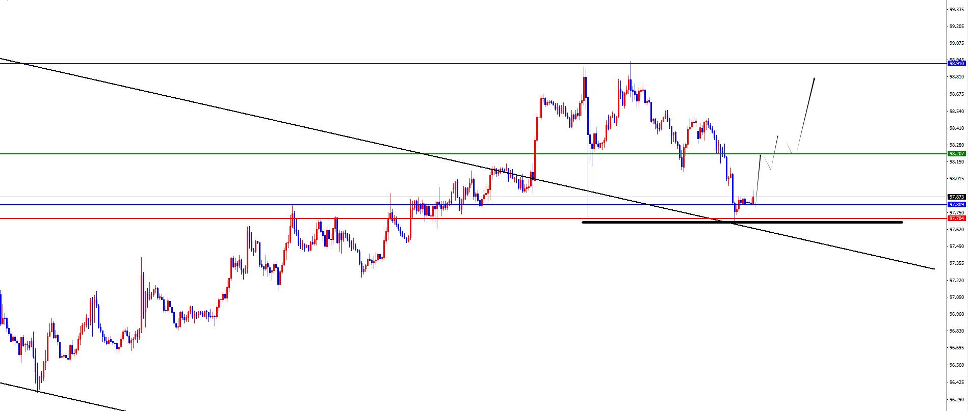 美指97.70-80区域多,防守5美金,目标98.20-98.90