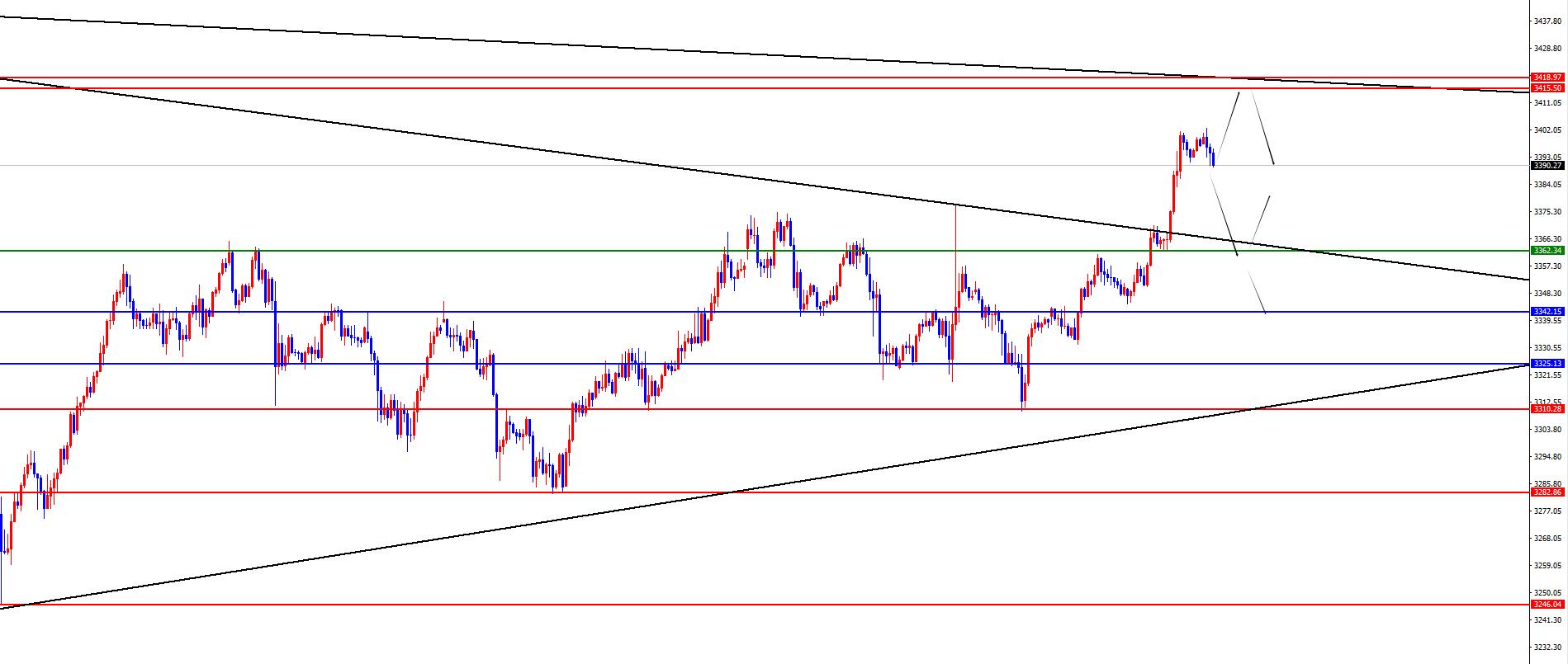 从多周期分析,首先观察月线节奏,价格在5月份正如笔者所言按照节奏运行,并且最终十字状态,6月份最终价格依旧是反K状态收尾,所以针对多依旧需要谨慎对待。从周线级别看,周线上近期价格持续高位震荡,随着时间的推移周线分水岭暂时于3325位置,价格在此位置之上偏多,对于后续价格周线收盘在此位置将进一步承压,目前市场依旧维持高位震荡。按照日线级别看,上周价格在日线支撑位置上方运行,价格虽然多次回踩但是最终没有下破,目前价格在日线支撑3342位置上方暂时关注震荡偏多,价格下破后才会延续。按照四小时级别看,周一价格继续在四小时支撑上方拉升,则短期依旧偏多,目前四小时支撑于3363区域支撑,同时上方阻力重点关注高点连线阻力3415区域。从一小时级别看价格短线有进一步修正的表现,但是考虑到日线收盘,谨防价格冲高3415附近回落。