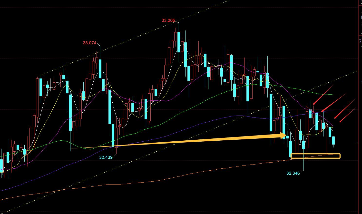 第二,白银方面:它的走势比黄金相对弱些,多次承压33关口,最终稳住于32.45一线顶底支撑,进行整理;