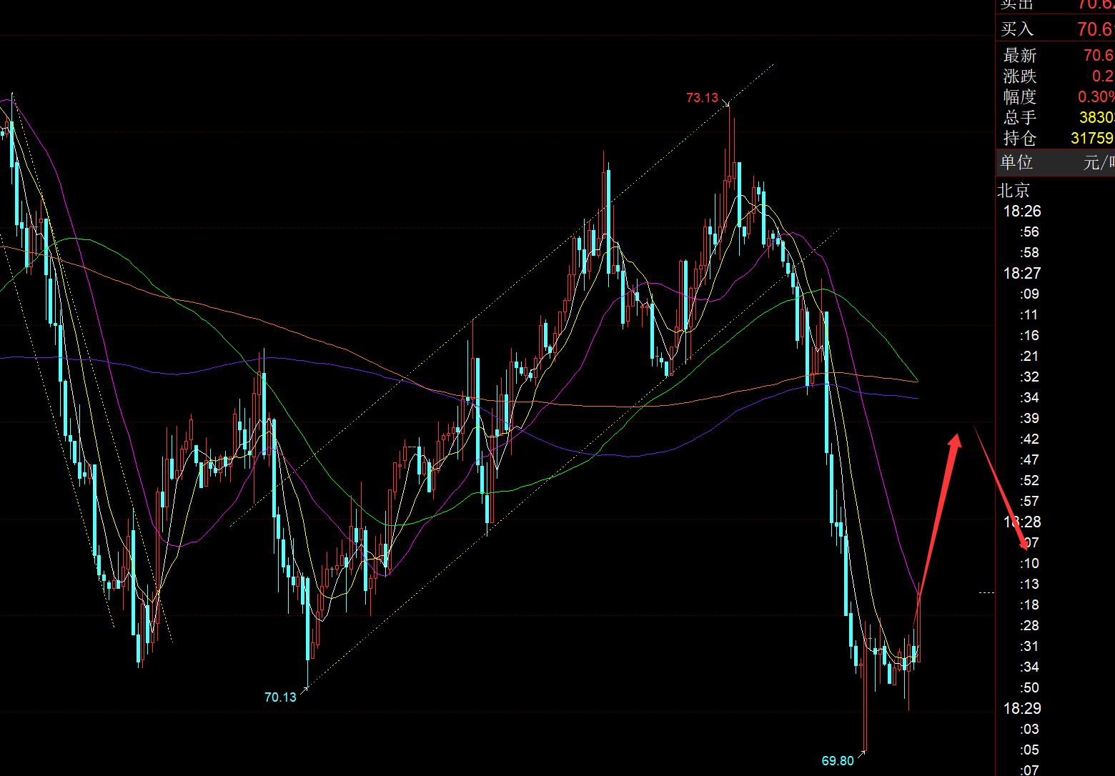 第三,原油方面:日线仍承压中轨有效,当有效失守短期上行通道下轨支撑后,果断72跟随看跌,如期大跌至70关口;