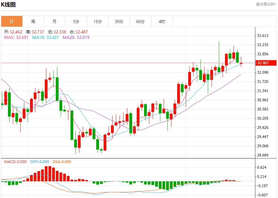 现货白银:截止北京时间21:21,现货白银下跌,现报32.504,跌幅0.04%。纽市盘前,白银价格发现难以在32.86美元上方巩固,难以提供新的负面交易并在下方结算,注意到EMA50继续为价格提供积极支持,并保护价格免受更多损失,而随机指标明显获得积极势头。