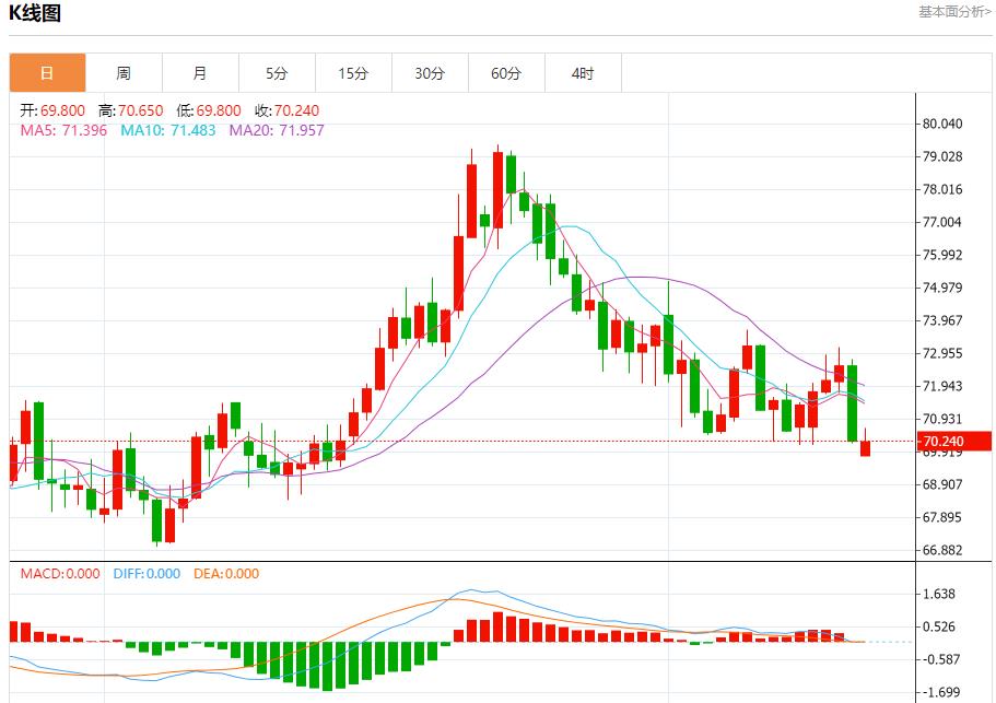 原油市场:截止北京时间21:21,美油下跌,现报70.22,跌幅0.30%。纽市盘前,原油价格继续下跌,以成功实现我们等待的目标70.30美元,并在此稳定,注意到价格在此水平上的负面压力,暗示试图超越它,并为未来几个交易日继续下跌开辟道路。