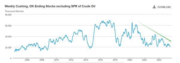 EIA原油库存反应美国全境的商业库存变化情况,俄克拉荷马州库欣地区的原油库存呢,反应WTI原油交货地的商业库存变化情况。对于研判WTI走势的交易者来说,库欣地区原油库存曲线意义重大。上图为数十年来库欣地区原油库存曲线图。长周期看,当库存总量达到5000万桶左右时触顶,当库存总量达到2000万桶左右时触底。2020年5月份以来,库存曲线从5000万桶向2000万桶移动,意味着从长周期看,美原油存在供不应求的局面。这也是美原油能够从2020年的最低点6.5美元反弹至当前65美元左右价格的原因。