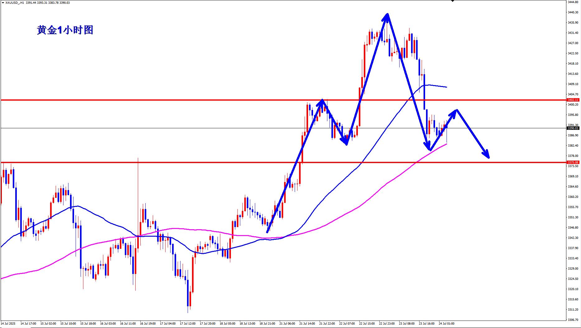黄金昨晚美盘在欧美关税协议接近达成的消息爆出后,市场避险情绪消退,黄金直接快速下跌,美盘反弹无力,黄金日线最终报收大阴线,黄金日线乌云盖顶,早盘3390直接空!