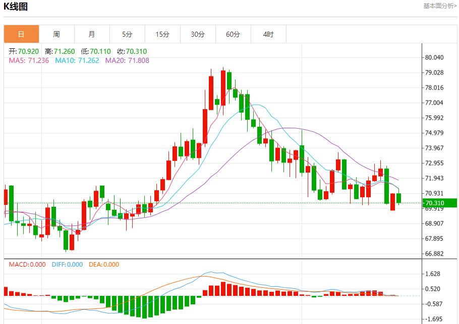 原油市场:截止北京时间21:21,美油下跌,现报70.31,跌幅0.54%。纽市盘前,原油价格持续上涨,突破71.00美元关口,这使得价格在未来几个交易日将获得更多预期收益,主要目标是测试72.30美元。