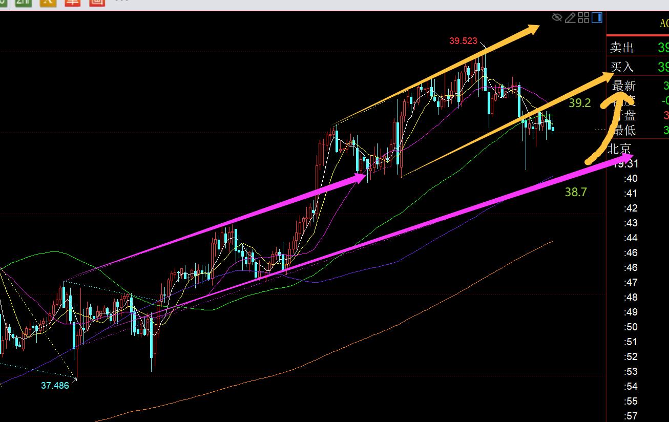 白银方面:日线级别,白银还保持良好的强势上涨形态,尽量仍回踩看涨为主;今晚黄色紫色通道下轨38.7支撑上企稳看涨,阻力39.2,突破站上才能回到黄色上行通道之内;