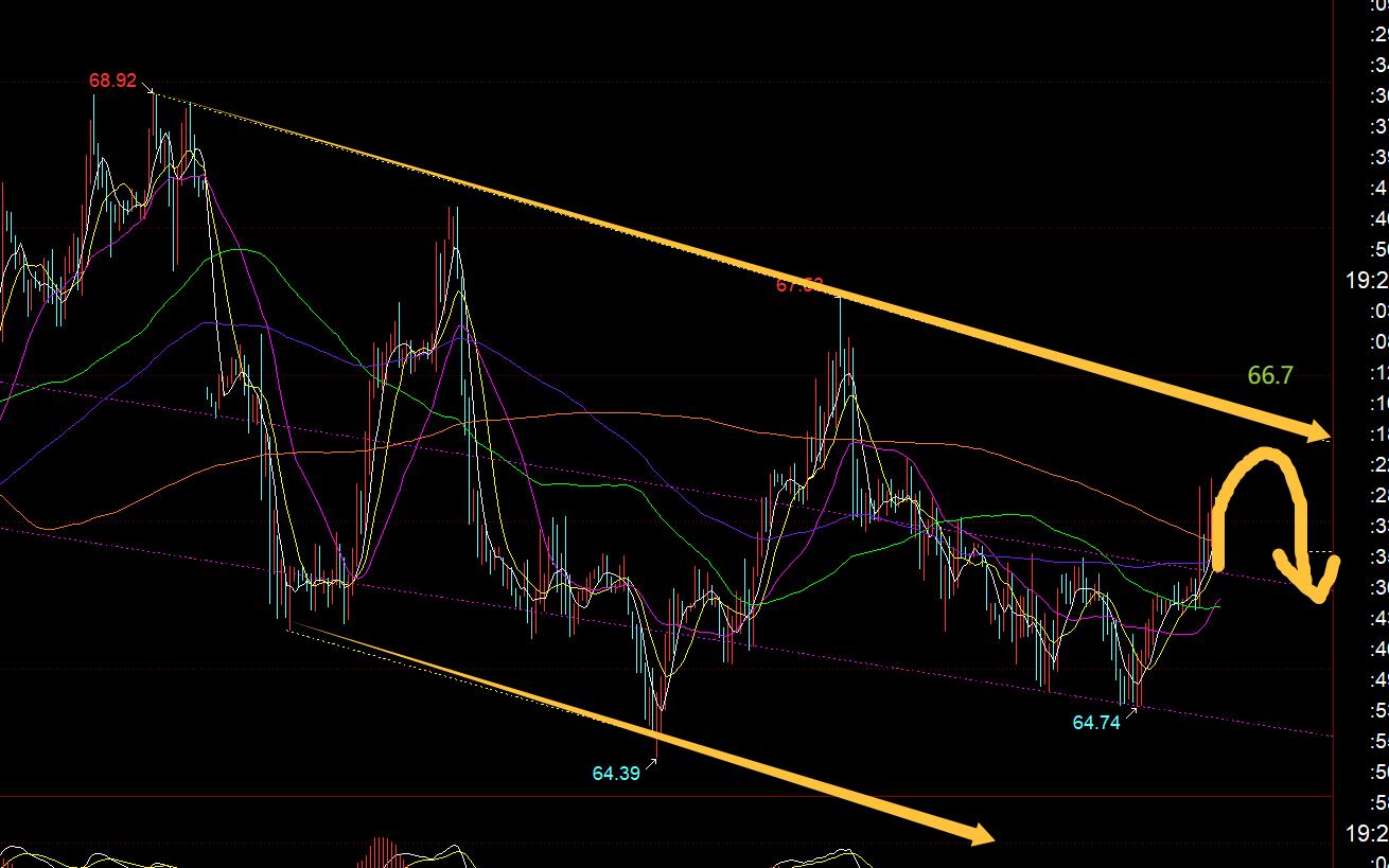原油方面:前几日一直提示指标底背离状态,会出现超跌反弹,一直磨到今日才迎来一波拉升;不过今晚要关注黄色通道上轨66.7之下,承压看压制回落,修复完背离之后,就要回归压制状态;