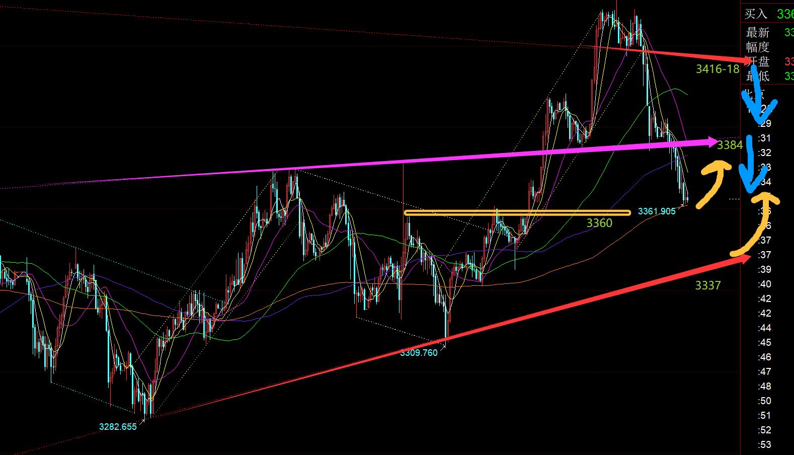 第三,黄金小时线级别:隔夜一波破位跳水,今日算是直接延续下跌,还并未修正昨晚跌幅,一路连阴慢跌,有些要一口气直接修正到位的感觉;目前徘徊于3360之上,此位置是3310-3438回踩的618分割支撑,一般面对这种618都要尝试下企稳力度,不过由于欧盘持续下跌,美盘前后先出现一波拉升,也可能是存在诱多,还有二次打压,所以一旦20点之后先反弹,就要择机拿下保护,3384中轨之下仍压制,则计划短线看二次打压回落;另外,如果一直磨到22点前,始终不出现诱多反弹,那么22点之后再企稳拉升,就最好不要轻易反弹看压制,容易出现V的走法,或者要上移更高的压力位去看承压,比如3416-18下;当然,震荡压制弱势下,618分割位置也守不住,直接向下延续二次打压力度,那么就真的可能一步到位,直接去逼近日线收敛三角下轨3337,靠近此位置上方就要敢于再短期炒底一次;还有一点,一路慢跌向下,短周期macd都陆续底背离,低位不好,也不敢直接追跌,很容易随时出现超跌反弹修正;