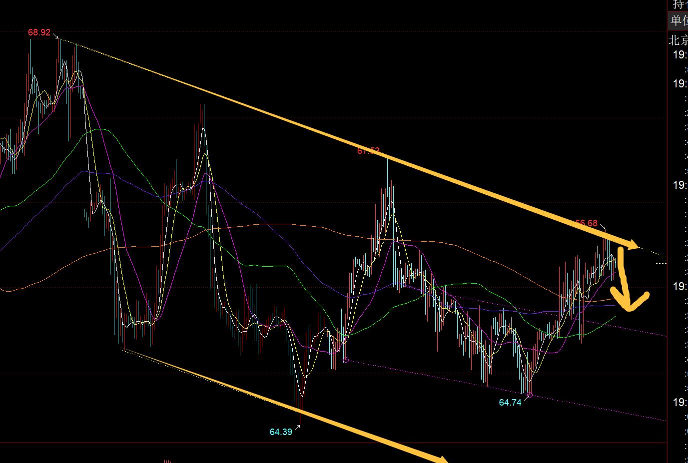 原油方面:当前黄色通道上轨有所承压,今晚66.6之下看压制,下方支撑65.5-65.3看得失,若失守,则进一步下探;反之,若突破新高站上66.6,则打破通道,会延续反弹上攻;