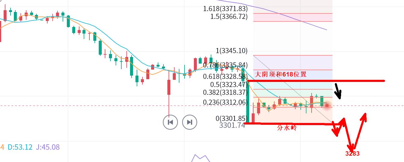 由于凌晨反抽的点在3320,早间触及后回撤,并没有到大阴线顶部,当前形成3321分水岭。