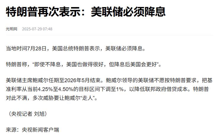 继上周四特朗普罕见视察美联储后,昨日特朗普再度表示,美联储必须降息。